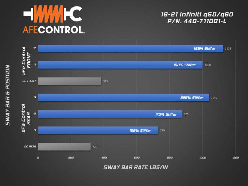 Transform your Infiniti into a canyon carving machine with aFe CONTROL sway bars. With 2-way adjustability in the front sway bar, you can easily dial in the handling balance. Body roll will be reduced, maximizing tire contact with the road. Sharpened steering response will improve initial turn-in making the car more agile and feel lighter. Whether its stability on the track, more rotation on the autocross, or just adding confidence in the canyon, aFe CONTROL sway bars will deliver. Every aFe Control sway bar is CAD designed and CNC bent to strict tolerances. This insures precise fit and perfect operation. Our front sway bar has 2-way adjustment. This allows the driver to dial in the front roll resistance to achieve the desired handling bias. Our front sway bars utilize CNC machined ends. These are TIG welded to the bar in a dedicated fixture to insure accurate hole positioning and consistent manufacturing. aFe Control includes low-deflection polyurethane bushings and premium 6061-T6 aluminum black anodized billet brackets. Brackets are equipped with grease fittings for easy maintenance.