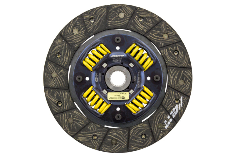 3000618 is a performance street disc and the most popular disc purchased. It features premium organic materials with high copper content for better heat transfer. Performance street discs allow for quicker shifting and smooth engagement. These discs feature a reduced marcel for faster shift action to complement ACT pressure plates. ACT spring-centered assemblies use bushings and cone springs similar to factory clutch discs. This creates frictional dampening, which improves clutch life and reduces noise. Quiet operation with increased strength and reliability.