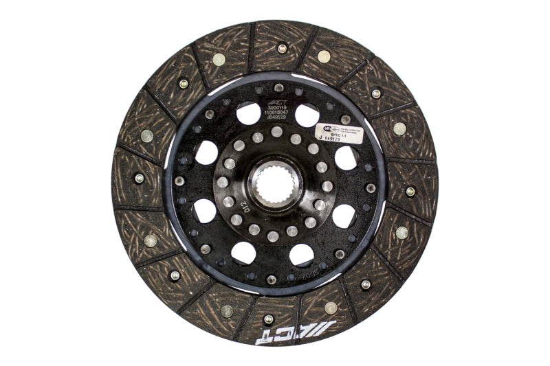 3000119 is a street rigid disc featuring premium organic materials with high copper content for better heat transfer and steel-backed lining for greater burst strength and durability. These discs are modified with reduced marcel for faster shift action to complement ACT pressure plates. The chrome-moly hub is heat-treated for strength and durability. Rivet design and materials are carefully selected for maximum strength. Lightweight, solid-hub design allows for quicker shifting and engagement. ACT's street rigid-hub discs provide race-proven performance with street manageability.