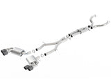 This 3" diameter with 2.25" diameter tail pipes Borla(r) Cat-Back(tm) system is intended for vehicles with significant performance upgrades. It contains a merge X-Pipe for increased performance and improved sound. The system delivers the aggressive ATAK(r) sound with no drone inside the vehicle. Each muffler assembly has unique dual 4" round carbon fiber with black center tips. A system with polished T-304 stainless steel tips is also available. The system will fit vehicles with Dual Mode Exhaust (NPP), but it does NOT include Dual Mode or AFM valves. On vehicles with AFM a check engine light will be activated. It may be used with the dual tip lower bumper cover to convert a single, split rear exit to a dual split rear exit. Borla(r) Cat-Back(tm) & Axle-Back exhaust systems feature patented straight-through and multi-core technology to unleash hidden horsepower. Increased exhaust velocity adds power, driving excitement, fuel economy, and the distinctive Borla(r) Sound of Power respected by motoring enthusiasts everywhere. Each system is built from premium T-304 austenitic stainless steel, superior to T-400 series knockoffs (such as 409), to give you the absolute best in performance and durability. Ultra-smooth mandrel bends ensure maximum flow & power, and precision computer numerical control (CNC) manufacturing ensures an accurate fit. Best of all, Borla(r) stands behind every system with a Million-Mile Warranty. Just what you'd expect from the world's most experienced (and most winning) exhaust brand.