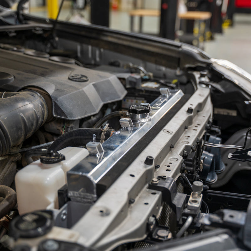 Upgrade your 2010-2024 Toyota 4Runner with a radiator built to match its legendary durability. Constructed from TIG-welded aluminum with robust aluminum side brackets, this radiator eliminates the brittle plastic components found in the stock unit, preventing cracks and leaks while ensuring a secure fit. A 60% increase in core volume and 120% increase in internal tube area paired with an oversized 7-row in-tank automatic transmission cooler provide superior cooling capacity, keeping temperatures under control whether you’re towing heavy loads or tackling demanding trails.--For added protection and efficiency, the radiator includes a magnetic drain plug to capture debris and a 1.3 bar high-pressure radiator cap that raises the coolant’s boiling point for improved system performance. Backed by the Mishimoto Lifetime Warranty, this radiator is a true two-for-one upgrade that delivers unmatched reliability and cooling power for your 4Runner.